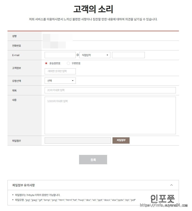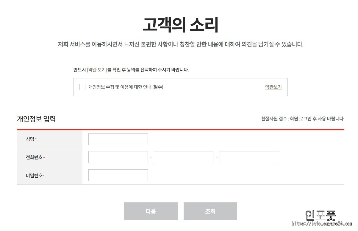 직접 전화하기 곤란하다면 홈페이지 내 고객의 소리 코너에서 문의를 따로 남길 수 있습니다.